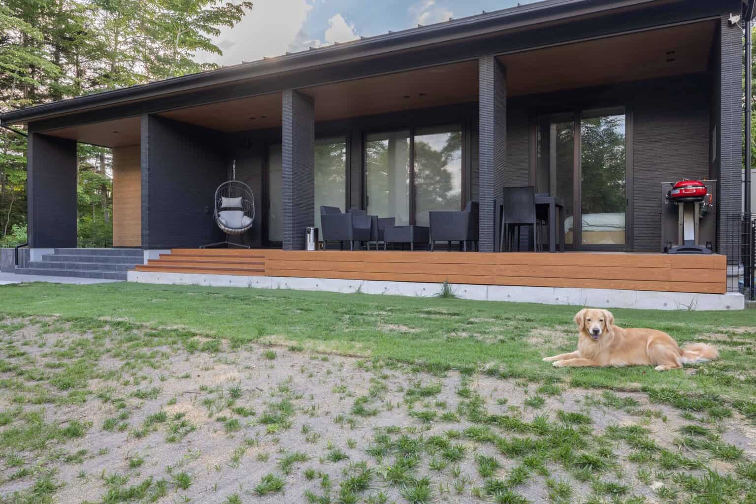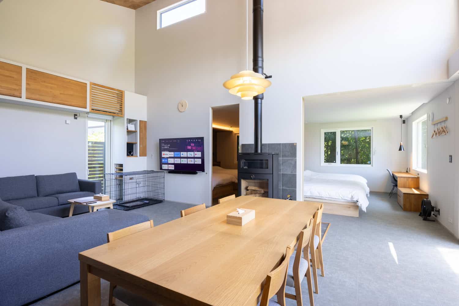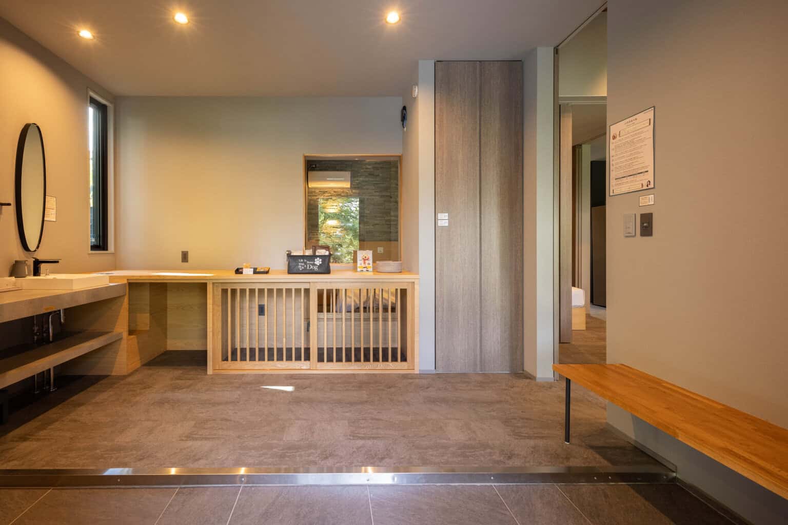 宿は 3つのベッドルーム、ゆとりあるLDK、サウナ を備えた和モダンの平屋造り。さらに、約400㎡の 天然芝プライベートドッグラン、愛犬のための トリミング室 と 水洗トイレ も完備しています。半屋内テラスでは BBQ や 星空ダイニング もお楽しみいただけます。